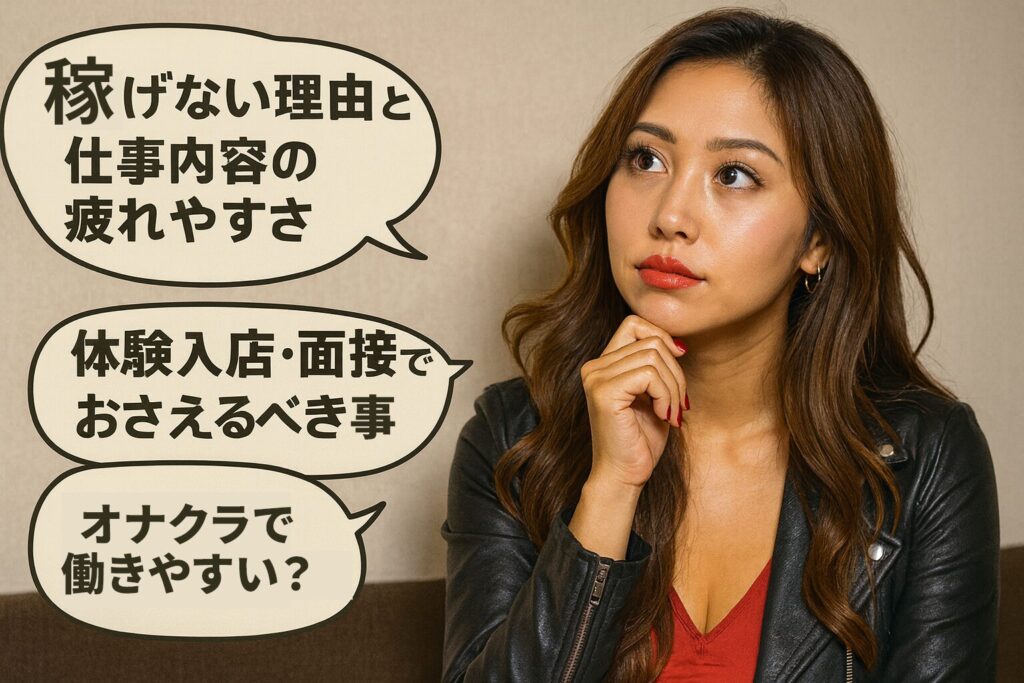 「オナクラって本当に稼げるの?」──そんな疑問を抱く風俗未経験の20〜30代女性に向けて、仕事内容の実態や給料事情、稼ぐためのコツをわかりやすく解説します。オナクラは体の接触が少ないソフトサービスとして知られ、未経験でも始めやすいのが特徴です。初心者が不安なく始められるよう、体験入店や面接のポイント、稼げるテクニックまで幅広く紹介していきます。